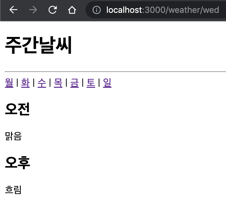 - 여기서는 /:day 가 id값 역할을 한다. (이 자리에 입력한 <Link> 태그의 /weateher 뒤 주소값을 가져온다)