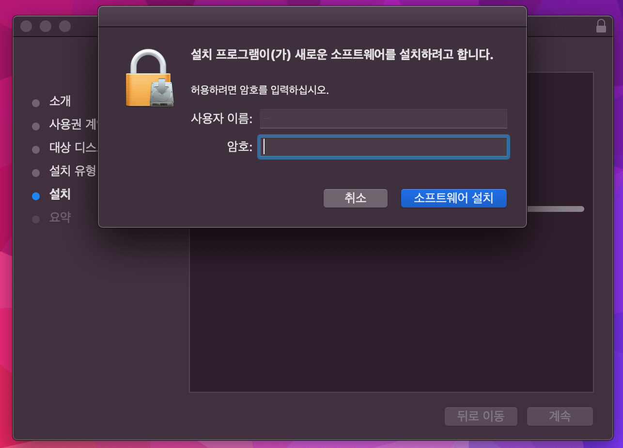 설치할 때 나왔던 비밀번호를 입력해준다. (복붙하면 편함)