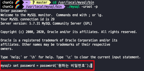SET PASSWORD = PASSWORD('원하는 비밀번호');