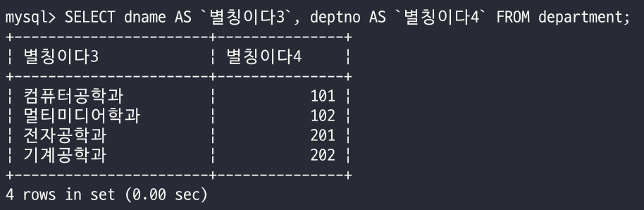 SELECT 컬럼1 AS `별칭1`, 컬럼2 AS `별칭2` FORM 테이블이름;