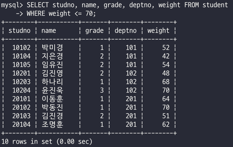 - 학생 테이블에서 몸무게가 70kg 이하인 학생만 검색하여 학번, 이름, 학년, 학과번호, 몸무게를 출력
