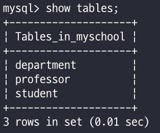 - use 데이터베이스이름; 명령어 사용 후, 선택한 데이터베이스 안에 존재하는 테이블의 목록을 보려면 아래 명령어를 입력한다.
