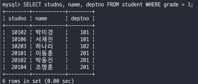 - 학생 테이블에서 1학년 학생만 검색하여 학번, 이름, 학과 번호를 출력