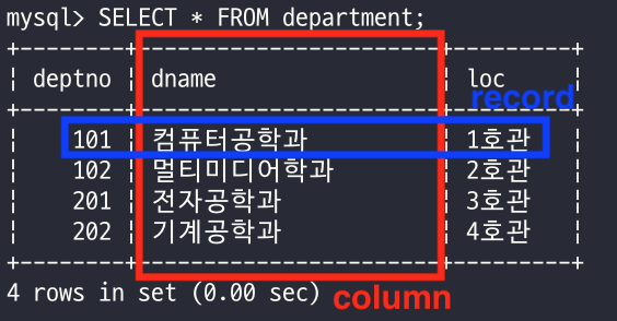 - Record: 표의 내용. 즉, 한 행(가로)을 뜻하며 한 줄의 데이터를 말한다.