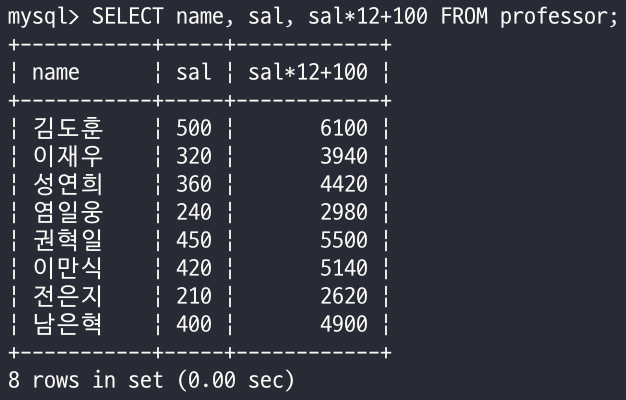 - 컬럼 이름에 산술 연산을 적용하면 조회 결과에 적용되어 출력된다.
