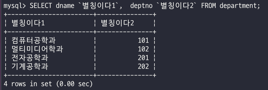 SELECT 컬럼1 `별칭1`, 컬럼2 `별칭2` FORM 테이블이름;