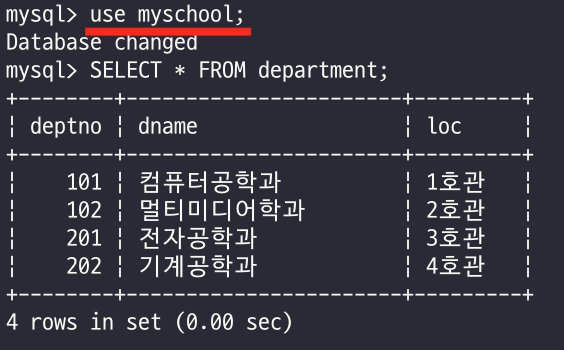 - 아래 명령어를 입력하면 해당 데이터베이스를 사용할 수 있다.