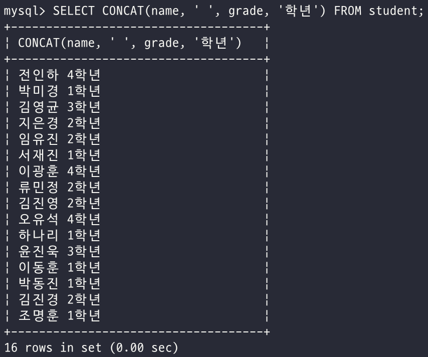 - 학생 이름과 학년을 하나의 문장으로 합쳐 출력하시오.