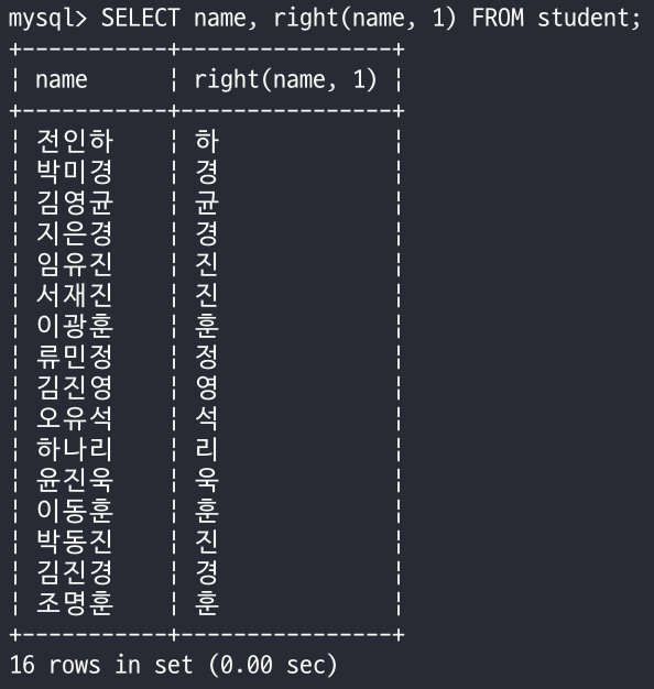 - 학생 테이블에서 학생의 이름과 이름의 마지막 글자를 조회하시오.