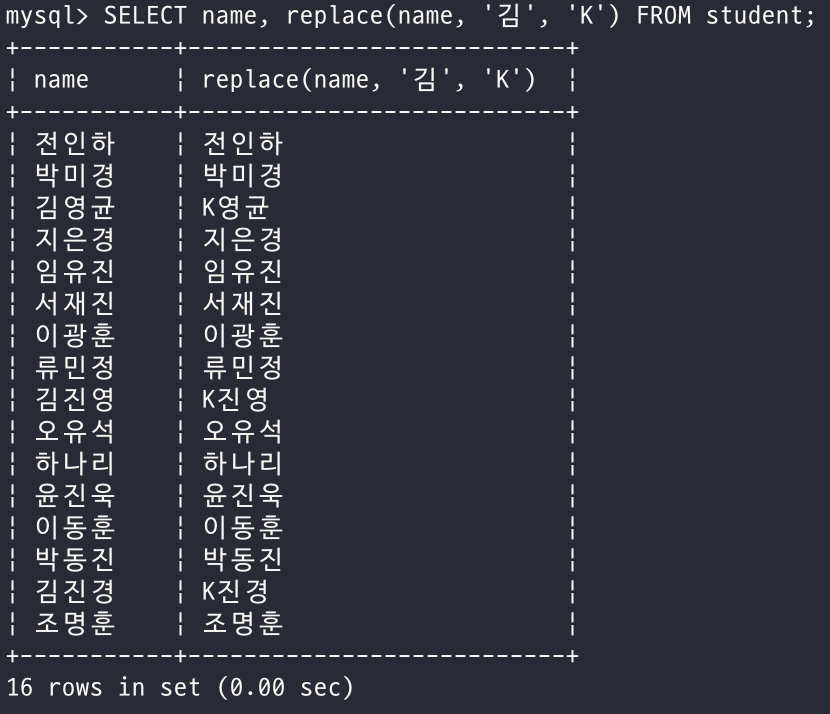 - 학생 이름과 이름에서 '김'을 'K'로 변경한 값을 출력하시오.