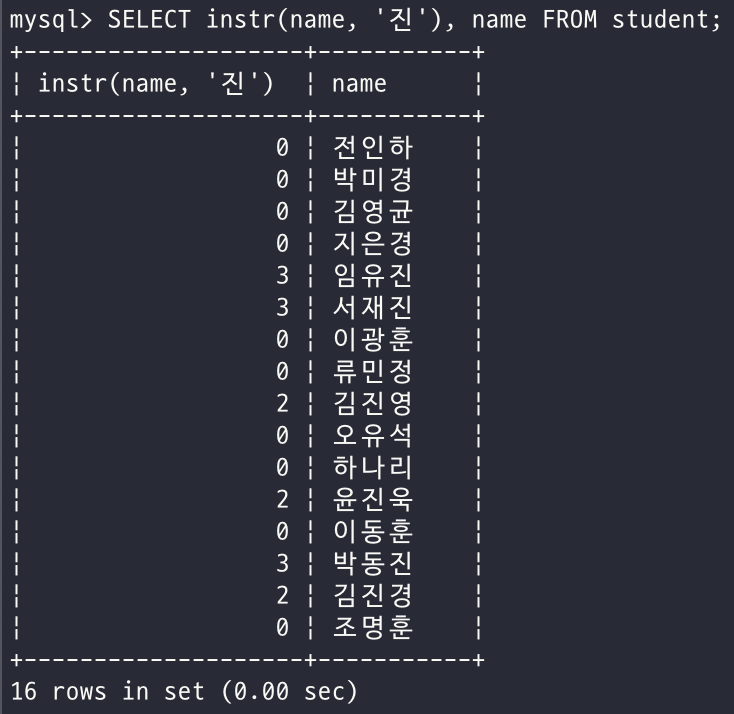 - 학생 이름에서 '진'이라는 글자가 나타나는 위치와 이름을 조회하시오.