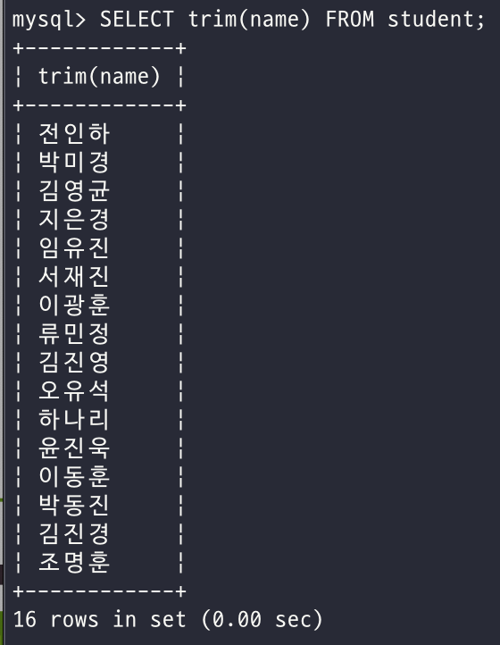 - 학생의 이름에서 앞뒤 공백을 제거한 값을 출력하시오.