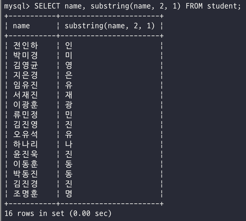 - 학생 테이블에서 이름과 이름의 두 번째 글자를 조회하시오.