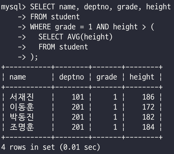 - 1학년 학생 중에서 키가 전체 학생의 평균키를 초과하는 학생의 이름, 학과번호, 학년, 키를 조회하시오. (집계 함수와 함께 사용)