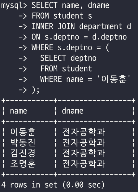 - 해당 학생과 같은 학과에 재학중인 학생의 이름과 소속학과 이름을 조회하시오. (JOIN과 함께 사용)