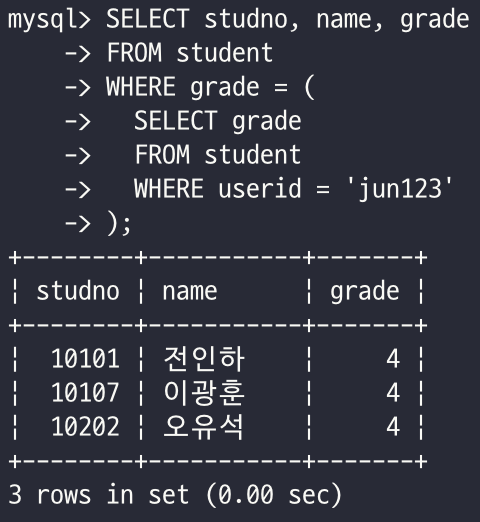 - 아이디가 'jun123'인 학생과 같은 학년인 학생의 학번, 이름, 학년을 조회 하시오.