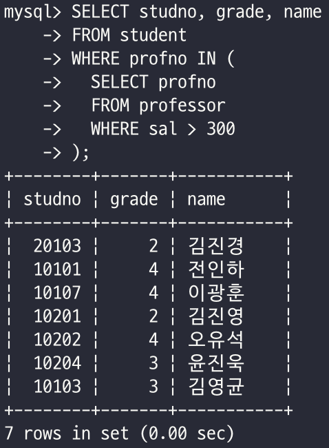 | 다중 행 서브쿼리 | 하나 이상의 검색결과를 반환하는 형태. 서브쿼리를 검색결과로 사용하기 위해 IN 연산자가 사용된다. |