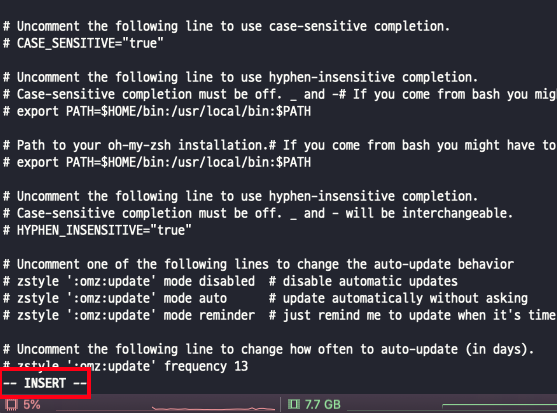 - 방향키로 파일의 맨 아래로 이동한 후 입력(INSERT) 모드 전환을 위해 i를 누른다.